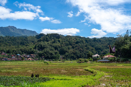 Idyllic landscape in the mountaineous area of Toraja, South Sulawesi, Indonesia. Little traditional villages with tipical boat shaped roofs among terraced rice paddies and jungle.