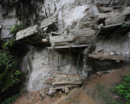 Indonesia, Tana Toraja - Londa, is a very extensive burial cave at the base of a massive cliff face The entrance to the cave is guarded by a balcony of tau tau Inside the cave is a colection of coffins with the bones either scattered or heaped in piles