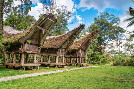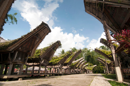 Row of traditional houses in a tipical traditional village of Tana Toraja, South Sulawesi, Indonesia. Wide angle view from below in a bright day of summer. Outstanding local architecture, boat shaped rooftop and traditional decoration.