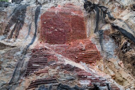 Groups of old family coffins with bones hanging on a rock. Tana Toraja region. Sulawesi island. Indonesia