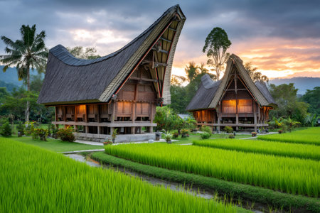 Traditional tongkonan houses rising above green rice paddies at sunset in Tana Toraja Regency, Sulawesi, Indonesia