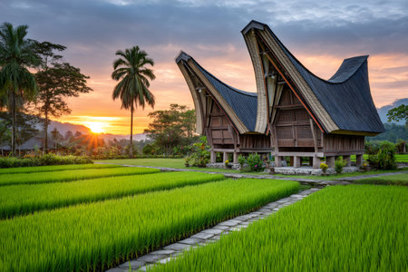 Two rumah gadang, traditional minangkabau houses, illuminate the rice fields at sunset near bukittinggi, west sumatra, indonesia