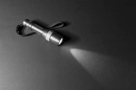 Flashlight and a beam of light in darkness. A modern led lamp with bright projection on dark table. Surface with copy space.