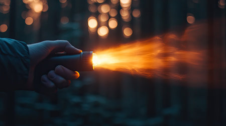 A hand holds a flashlight, casting a warm orange glow in a dark forest, surrounded by a magical bokeh effect, capturing the essence of adventure and exploration.