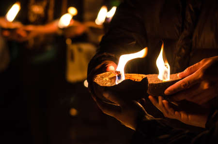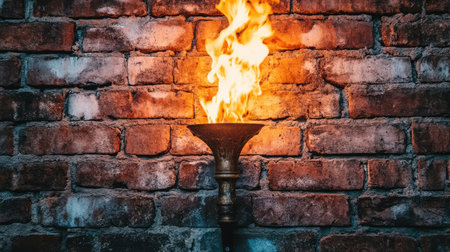 A vibrant flame dances atop a traditional torch illuminating its textured surface. The dark background enhances the warmth of the fire creating a captivating scene during a festive occasion.