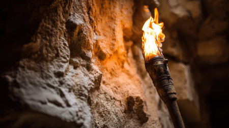 A captivating image of a lit torch casting a warm glow against an ancient stone wall in a cave. Perfect for themes of adventure and exploration.
