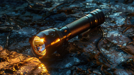 A black flashlight rests on a rugged rocky surface, casting a warm beam of light against the backdrop of a beautiful sunset. Perfect for outdoor adventure.