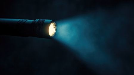 A close-up image of a bright flashlight casting a powerful beam of light into a dark space, highlighting its sleek design and functionality.