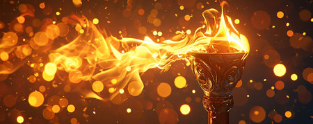 Torch with flame on blurred dark background with lights and sparkles. Olympic Games Fire
