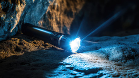Bright LED flashlight beam shining on cave walls, showing rough rock formations