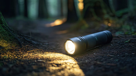 Close-up of a portable LED flashlight illuminating a narrow path in a dark forest at night