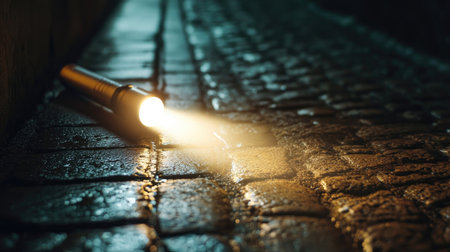 LED flashlight beam illuminating a narrow alleyway at night, with wet cobblestones reflecting light
