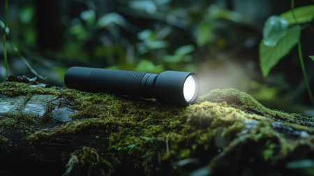 A black tactical flashlight resting on a mossy log in the forest with a faint beam illuminating the surroundings