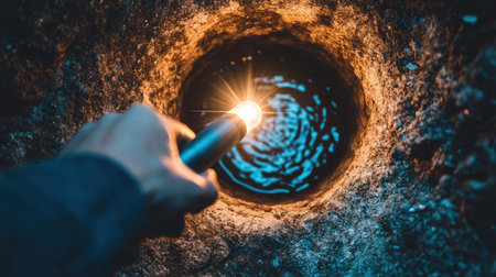 A handheld torch shining into a deep well, revealing water and stone reflections