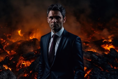 a man in a black suit against the backdrop of hell