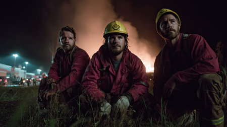 Group of firemen sitting on the ground at night with fire in the background
