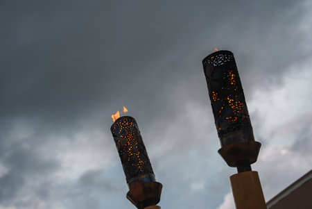 Lit Tiki Torches with Perforated Patterns Against Cloudy Sky