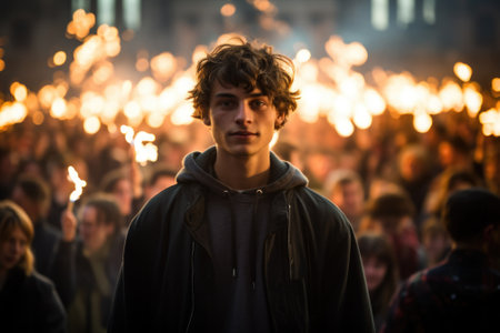 A person holding a lit torch. Concept of danger and excitement. The person holding the torch is likely participating in a celebration or a protest, and the fire adds to the intensity of the moment