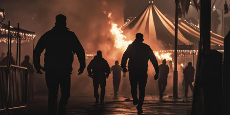 Dramatic Night Scene with Silhouetted Figures and Fiery Carnival Atmosphere.
