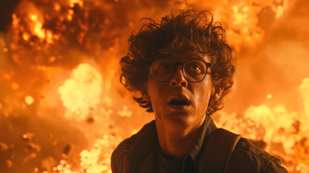 A person in glasses appears shocked and alarmed as a massive explosion erupts in fiery chaos directly behind them, capturing a moment of intense action.
