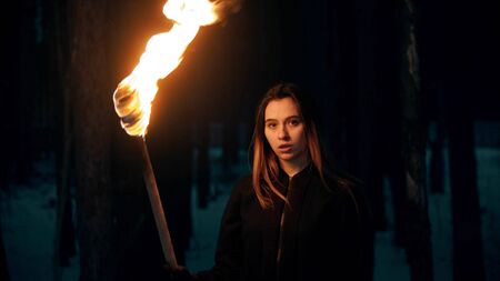 Young woman with torch posing in night forest