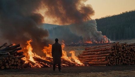A man in a gray coat stands on the edge of the field and looks at the burning fire.