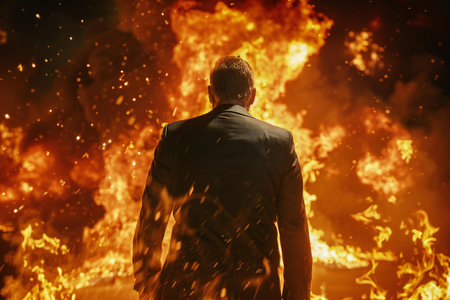Rear view of a businessman standing in front of a huge fire