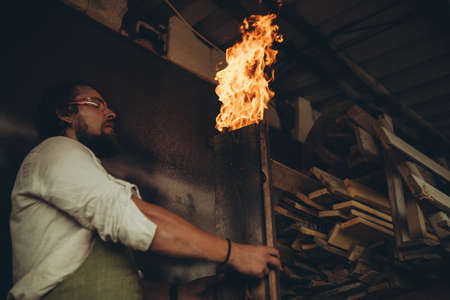 A man kindles a flame at the old rusty blowtorch.