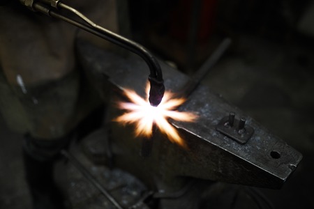 Close-up male welder welds metal using a gas burner. Worker use gas burner for metal parts in a workshop.