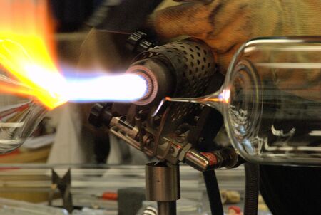 Process glass blowing manufacturing . Fire heats glass blank with glass-blowing burner. Handmade glassworks