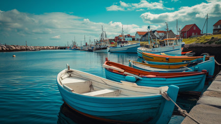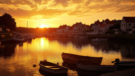 A breathtaking sunset casts warm hues over a calm harbor, featuring colorful boats gently floating on still water, creating a peaceful and idyllic scene.
