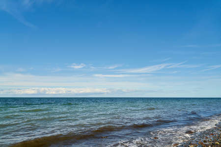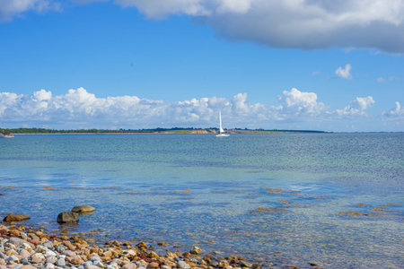 Scenic stony beach and rocks with boats in the background at the Baltic Sea in Northern Germany