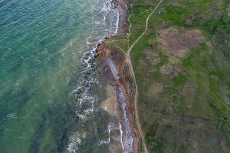 Steep sea shore and surf. Sea water muddy with sand after storm and algae. Aerial view