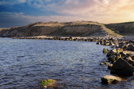 Tranquil Bulgarian seaside landscape with quiet blue reflective Black Sea and old dark rocky stones against bright sunny evening sunset