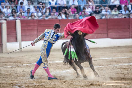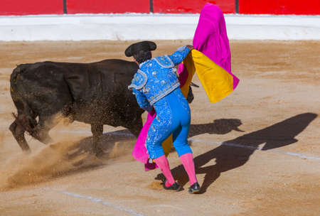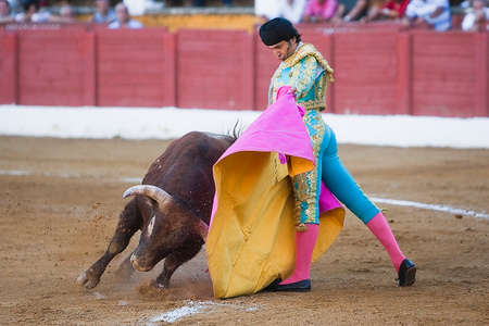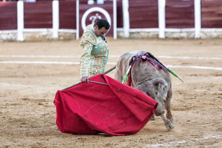 Ubeda, Jaen province, SPAIN - 29 september 2010 Spanish bullfighter Manuel Jesus with the cape bullfighting a bull of nearly 600 kg of grey ash during a bullfight held in Ubeda, Jaen province, Spain, 29 september 2010