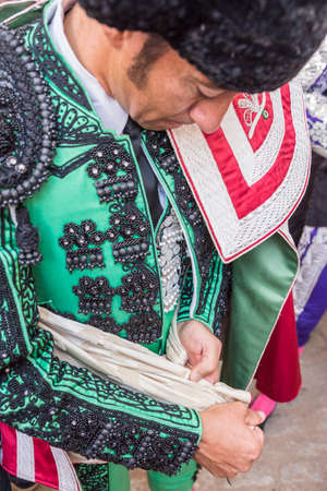 Pozoblanco, SPAIN - September 29, 2010: Spainish bullfighter putting itself the walk cape in the alley before going out to bullfight, typical and very ancient tradition in Pozoblanco, Spain