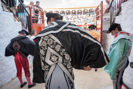 Baeza, Jaen province, SPAIN - 15 august 2009 Bullfighters at the paseillo or initial parade Bullfight at Baeza bullring, Baeza, Jaen province, Andalusia, Spain