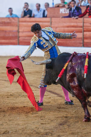 Sabiote, Spain - August 23, 2014: The Spanish Bullfighter Adrian de Torres bullfighting with the crutch in the Bullring of Sabiote, Spain