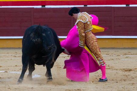 Madrid, Spain- April 30, 2022: Bullfight in San Martin de Valdeiglesias. Bullfighter with cape. Fighting bull. Bullfighter giving a capote pass to the bull in a bullring.
