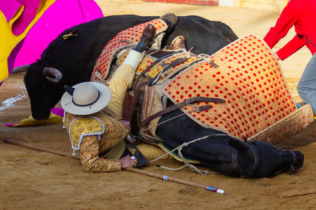 Madrid, Spain- April 9, 2022: Chenel Cup in Miraflores de la Sierra. The horse is dressed by the bull during the bullfight.