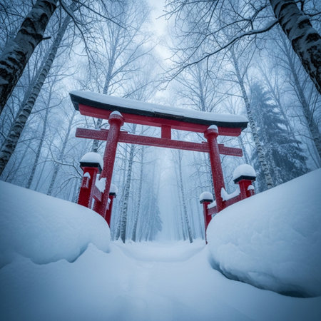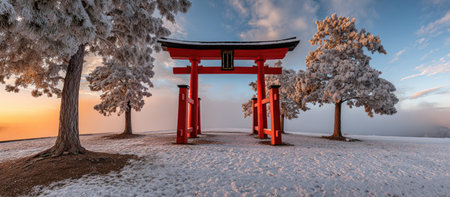 A vibrant red Torii gate stands prominent in a snowy landscape, flanked by frost-covered trees. The composition includes a clear sky and soft lighting. This image could be used for various commercial projects, including travel promotion, cultural themes, or website design elements. The overall aesthetic suggests serenity.