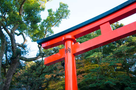 Beautiful red tori gate at Maruyama of Kyoto. Path with a japanese torii gateways entrance through a park to shinto temple. Famous tourist landmar sanctuary with traditional architecture at Japan