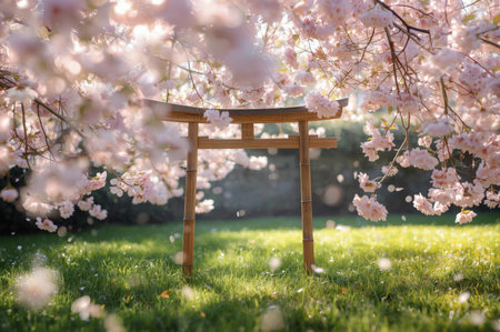 Japanese garden with cherry blossoms and wooden table in spring time.