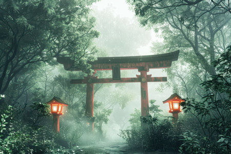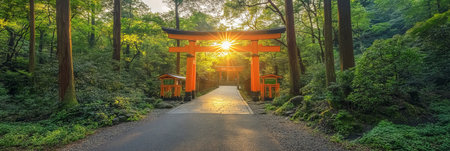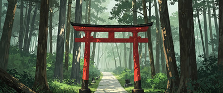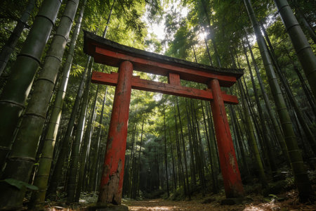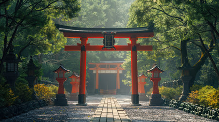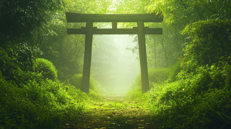 Explore a tranquil scene featuring a striking torii gate nestled in a lush forest, illuminated by soft sunlight. Ideal for serene nature and travel themes.