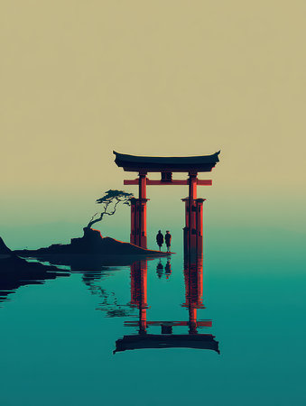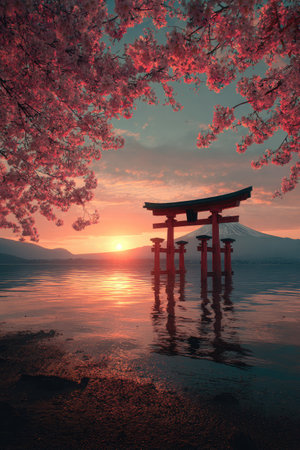 A stunning view of a torii gate reflecting on tranquil waters at sunset, showcasing serene beauty and harmony in nature. Perfect for travel and landscape themes.