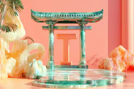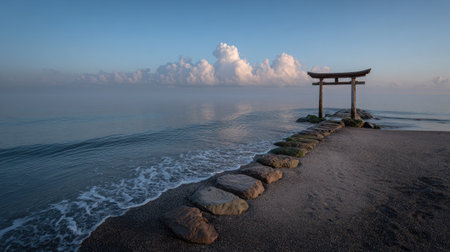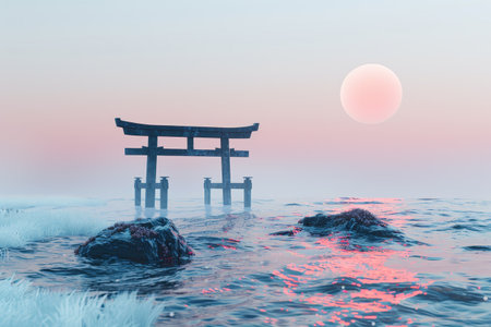 An image showcases a traditional Japanese torii gate situated in the ocean. The scene features a gate with pillars in the water, framed by rocky formations and a serene sea. The composition, bathed in soft lighting, highlights the gate against a clear sky, suitable for various applications.