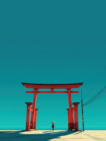 A striking image of a red torii gate against a clear blue sky, featuring a solitary figure with an umbrella, creating a tranquil atmosphere ideal for travel and culture themes.