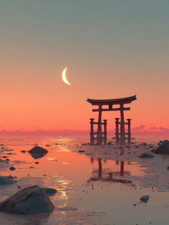 A peaceful sunset scene featuring a torii gate reflected in serene water. The crescent moon adds a magical touch to this tranquil landscape, evoking calm.