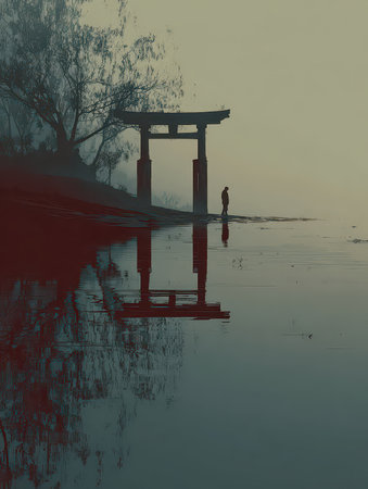 A tranquil scene featuring a traditional torii gate reflected in calm waters. Soft fog envelops the landscape, creating a serene and peaceful atmosphere.
