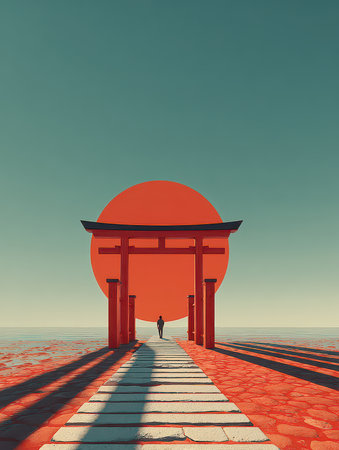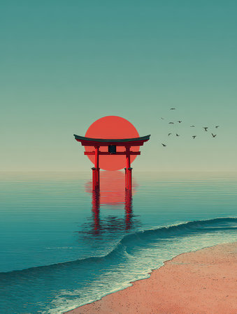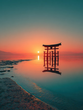 A stunning depiction of a torii gate at sunset, reflecting in calm ocean waters. The serene landscape evokes tranquility, perfect for relaxation and inspiration.